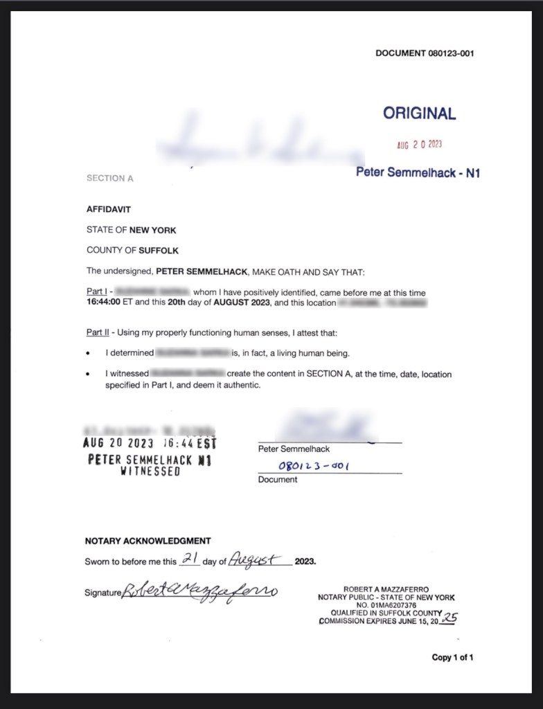 So – what is it? What does this new thing’s existence mean and/or imply? How does its reality differ from my intent? The picture at the top of this post is an image of my first “existential notarization” of an actual person. I’ve blurred out the specifics for privacy purposes but the document, in essence, serves two functions:
