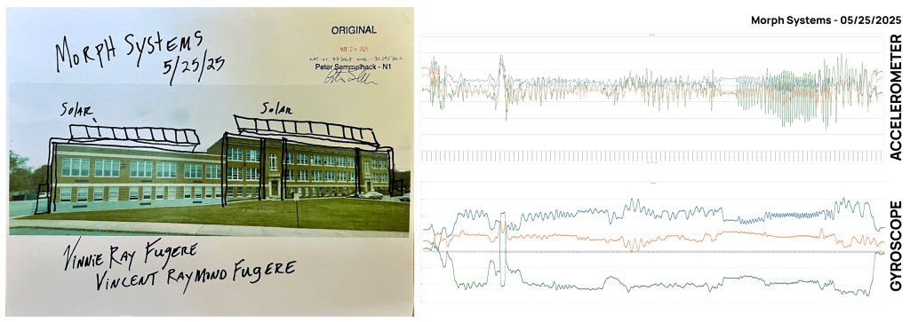 The “resolution” for this performance was based on seven, real-time sensor readings taken from Vinnie’s right arm as it moved through spacetime to make the illustration – g-force, linear acceleration, gyroscope, inclinometer, barometer, magnetometer and sound level. These measurements become, in essence, the artwork’s unique signature — the readings and artwork are each defining/describing the other.